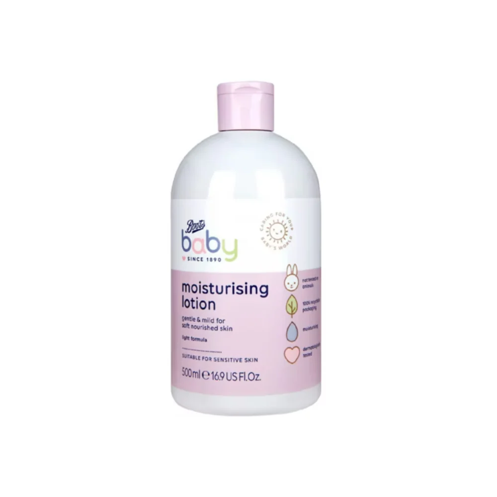 The Boots Baby Moisturizing Lotion is specially designed to keep your baby’s delicate skin soft, smooth, and protected. Enriched with gentle emollients, this lightweight lotion provides long-lasting hydration without feeling greasy. Its mild, dermatologically tested formula absorbs quickly and helps prevent dryness, leaving your baby’s skin nourished and comfortable all day long.