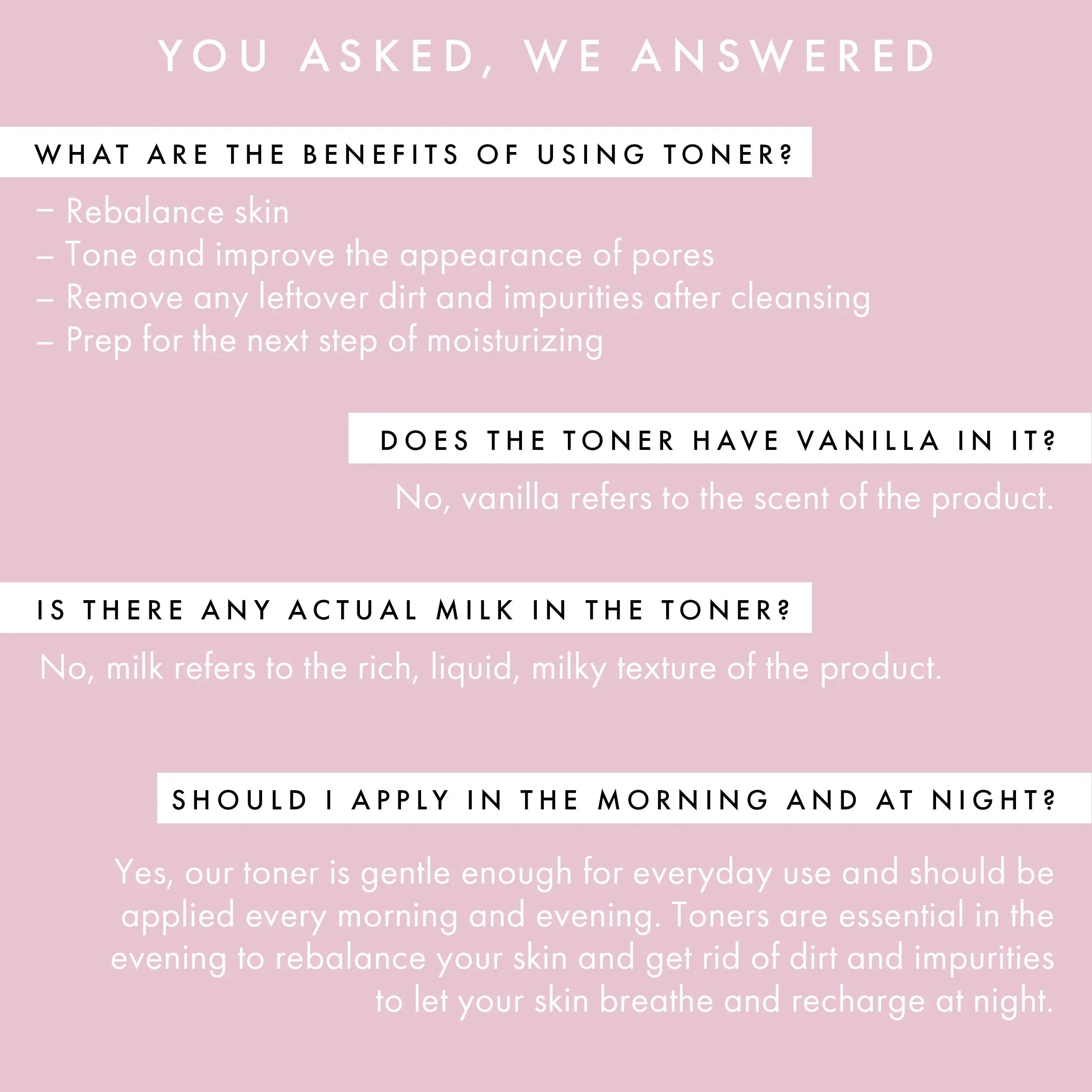 My vanilla milk toner is an alcohol-free formula that helps balance skin, smooth texture, and minimize the appearance of pores. This skin-perfecting toner is an essential step for smooth, replenished skin after each cleanse.