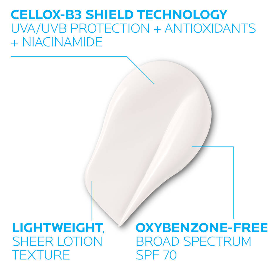 Anthelios UV Correct daily anti-aging sunscreen for face with SPF 70 is clinically tested to blend easily into all skin tones. It helps correct and protect from visible signs of sun damage in a lightweight, non-greasy texture. Oxybenzone-free and Octinoxate-free formula with Cellox-B3 Shield® technology: broad spectrum UVA/UVB protection with antioxidants and niacinamide, a form of vitamin B3.