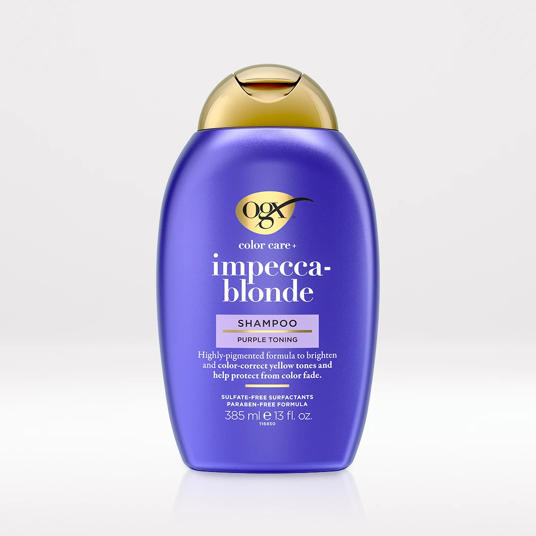 No matter if your hair is silver, pre-lightened or naturally blonde, let your hair be the best blonde it can be by adding this purple toning shampoo to your routine. Simply add this blonde hair shampoo to your routine to help color-correct yellow tones. This buildable coverage makes it the perfect product for those who want to personalize their tone! Want even more color-correction? Try pairing our Impecca-Blonde Purple Toning Shampoo with our powerful purple toning drops, along with your favorite OGX conditioner.