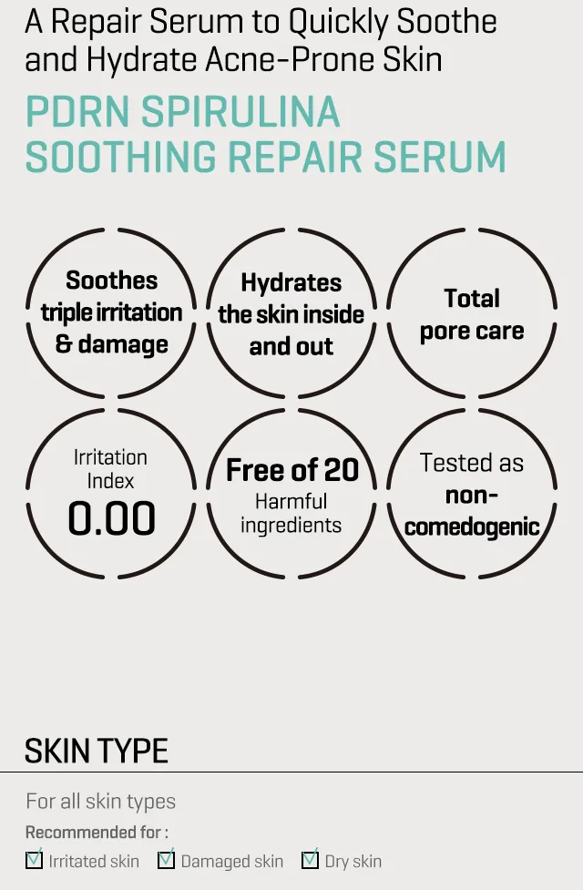 Soothe and repair a damaged skin barrier with this capsule serum containing spirulina-derived PDRN and marine amino acids. It’s rich in moisturizing and elasticity-care ingredients like marine mucin and peptides. The lightweight, watery texture absorbs quickly into skin and leaves a non-sticky finish. Hypoallergenic and non-comedogenic formula is suitable for sensitive skin.