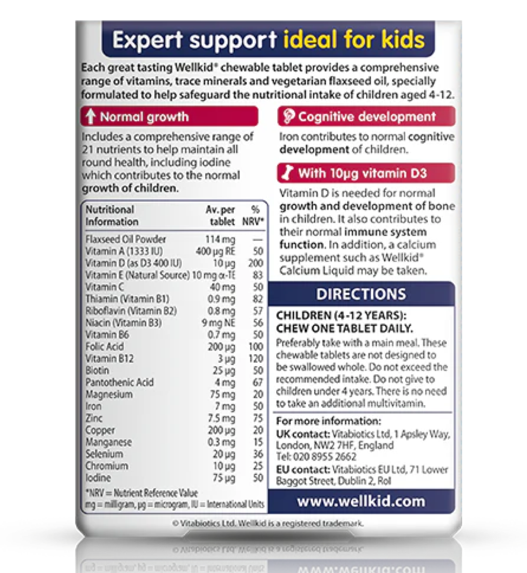 Wellkid Multi-vitamin Smart Chewable provides 10µg vitamin D, as recommended by the UK Department of Health.
