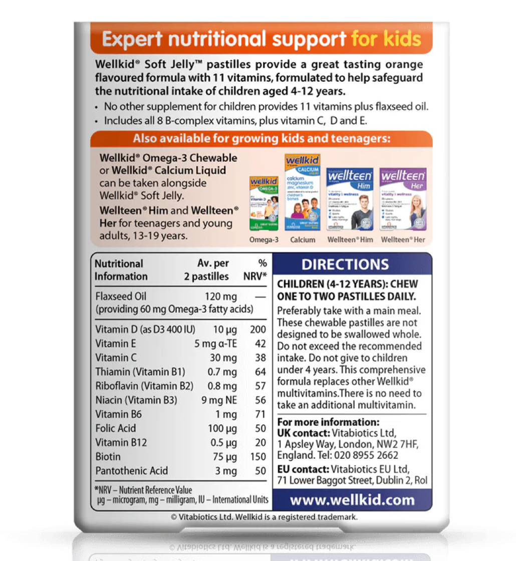 Wellkid Soft Jelly pastilles provide a multivitamin formula to help safeguard the nutritional intake of children aged 4-12 and are available in two great tasting flavours: Strawberry and Orange. No other supplement for children provides 11 vitamins plus flaxseed oil. Wellkid Soft Jelly includes all eight B-complex vitamins plus vitamin C, D and E. Two pastilles provide 10µg vitamin D as recommended by the UK Department of Health. Vitamin D is needed for the normal growth and development of bone in children.