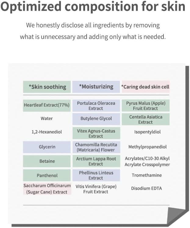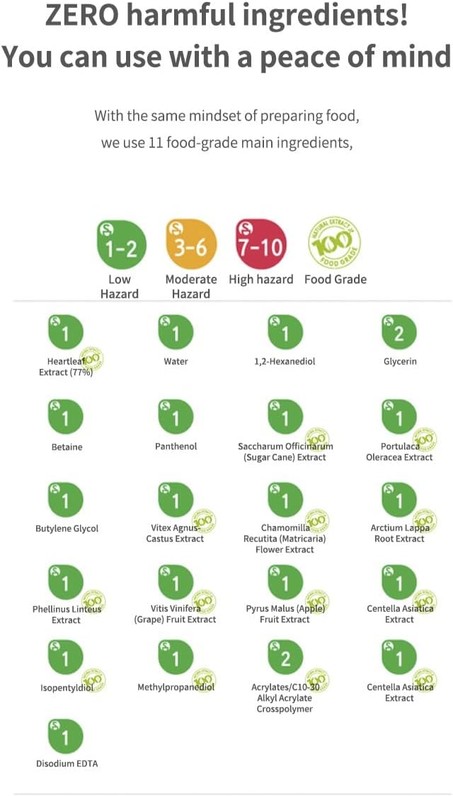 Houttuynia Cordata Extract(77%), Water, 1,2-Hexanediol, Glycerin, Betaine, Panthenol, Saccharum Officinarum (Sugar Cane) Extract, Portulaca Oleracea Extract, Butylene Glycol, Vitex Agnus-Castus Extract, Chamomilla Recutita (Matricaria) Flower Extract, Arctium Lappa Root Extract, Phellinus Linteus Extract, Vitis Vinifera (Grape) Fruit Extract, Pyrus Malus (Apple) Fruit Extract, Centella Asiatica Extract, Isopentyldiol, Methylpropanediol, Acrylates/C10-30 Alkyl Acrylate Crosspolymer, Tromethamine, Disodium EDTA